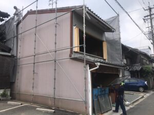 ご近所の皆さまにご協力いただいて、養生をかけて道路を通行止め🚧にして解体工事をしています。